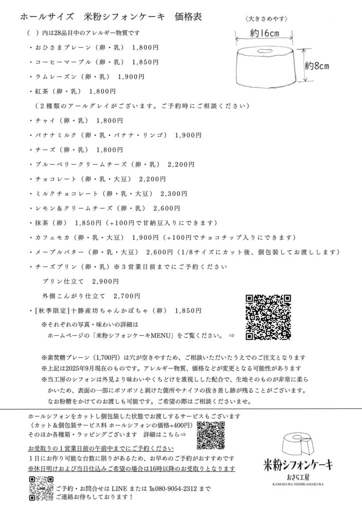 2025年12月20日(土)・21日(日)・23日(火)~25日(木)・27日(土)はクリスマス期間としてご予約のホールシフォンのみの販売とさせていただきます。(シフォンケーキの生地のみの販売です。販売品には上記写真のような生クリームやフルーツは乗っていません。27日は自販機販売も行う可能性もあります。決定し次第お知らせいたします)