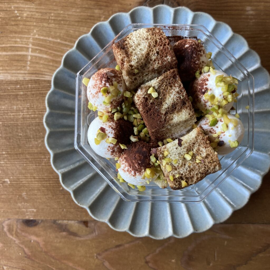 [原材料名] 牛乳(国内製造)、コーヒー、生クリーム、鶏卵、砂糖、米粉、加糖練乳、酵素糖化水飴、洋酒、クリームチーズ、インスタントコーヒー、ココアパウダー、ピスタチオ、こめ油、乾燥卵白、ゼラチン / トレハロース、ゲル化剤(増粘多糖類、加工でん粉)、カラメル色素、香料、(一部に卵・乳成分・ゼラチンを含む)