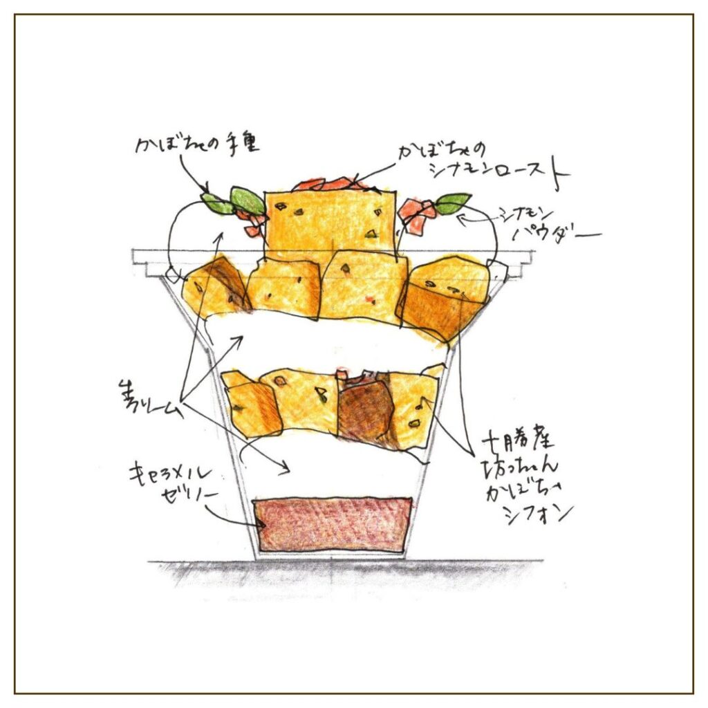 かぼちゃシフォンに生クリームを合わせて、上下に香ばしく、食感の異なるアクセントを少しづつ。